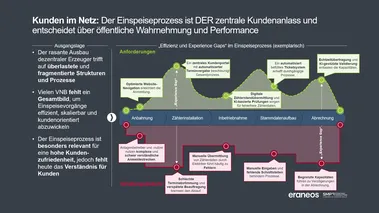Unsere Projekterfahrung mit VNB zeigt, entlang der Customer Journey im Einspeiseprozess bestehen Optimierungspotenziale – etwa bei komplizierten Klickstrecken bei der Anmeldung, verspäteten Terminbeauftragungen durch unklare Zuständigkeiten, fehleranfälligen manuellen Zählerstandübermittlungen oder fehlenden internen Systemschnittstellen zur automatisierten Datenverarbeitung. Diese führen häufig zu Staus in der Bearbeitung, steigenden Prozesskosten und überlasteten Servicekanälen. Auch die Zusammenarbeit mit Installateuren als zentraler Partner im Prozess ist bisher nicht ausgereift. Zusätzlich treibt die Variantenvielfalt des Prozesses die Komplexität: Unterschiedliche Größenklassen der Anlagen, Prozesse mit dem grundzuständigen oder wettbewerblichen Messstellenbetreiber und die große Vielfalt der Messkonzepte.